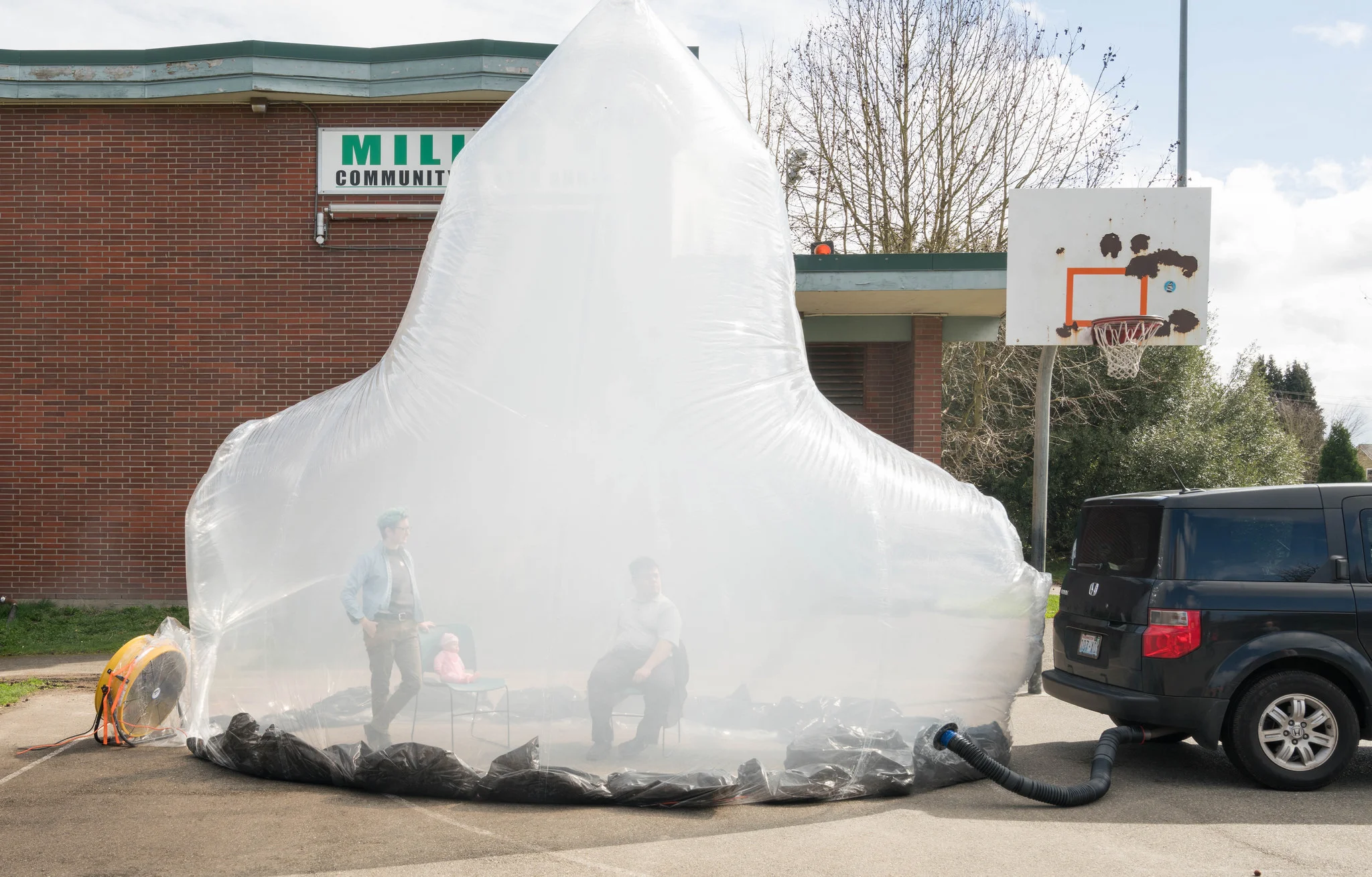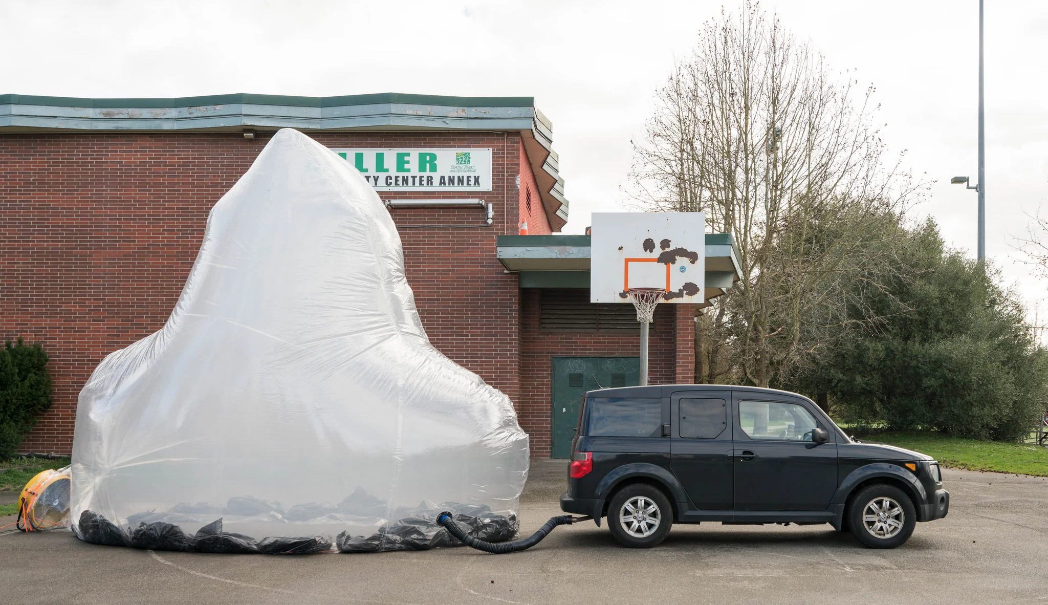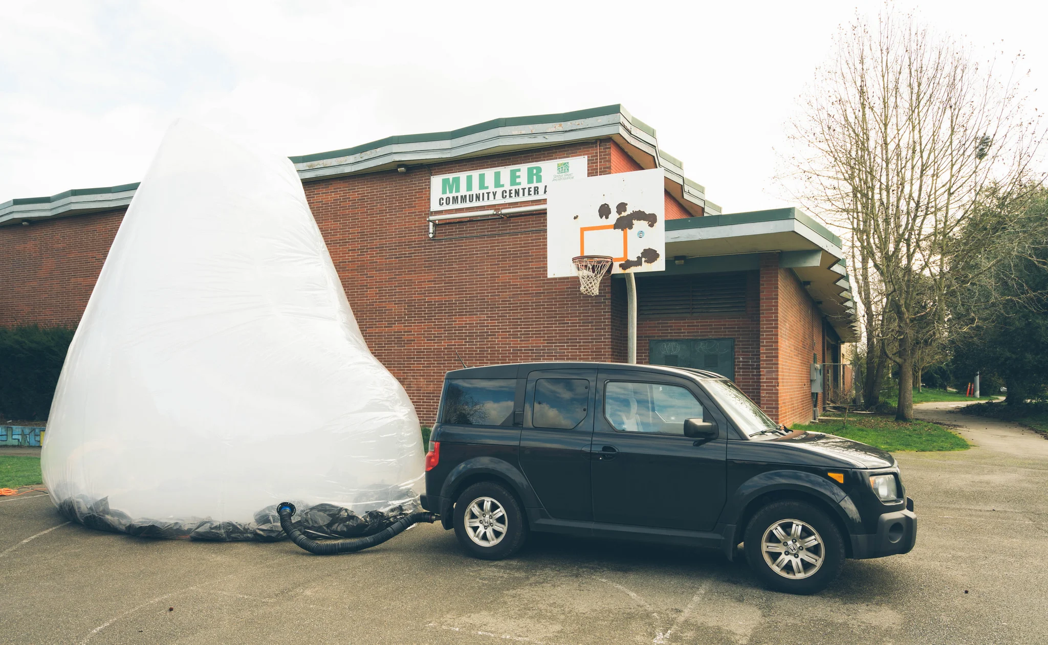 The extremely clear plastic was necessary in order for the piece to work as a stage which slowly and visibly fills with smoke over the course of a performance. While it appears that the cars is expelling exhaust into the inflatable we used a hidden smoke machine and a large fan to do the work (& keep the actors from dying). Because of its scale and necessary inclusion of an actual vehicle the first true test inflation of the piece didn't occur until an event earlier this spring at the Miller Community Center. That event was an opportunity to view the piece at scale, critique elements and chart a plan to make any tweaks.