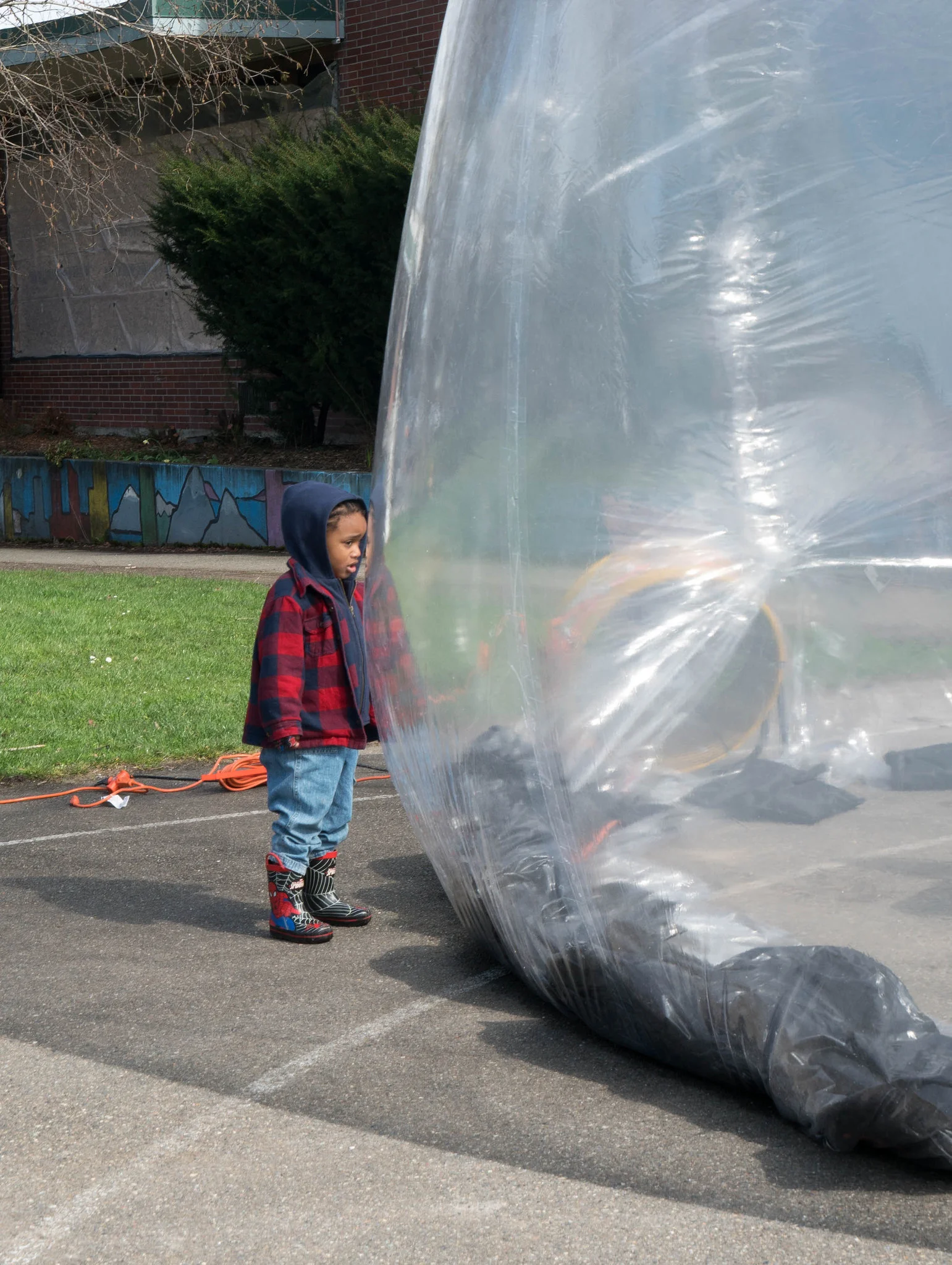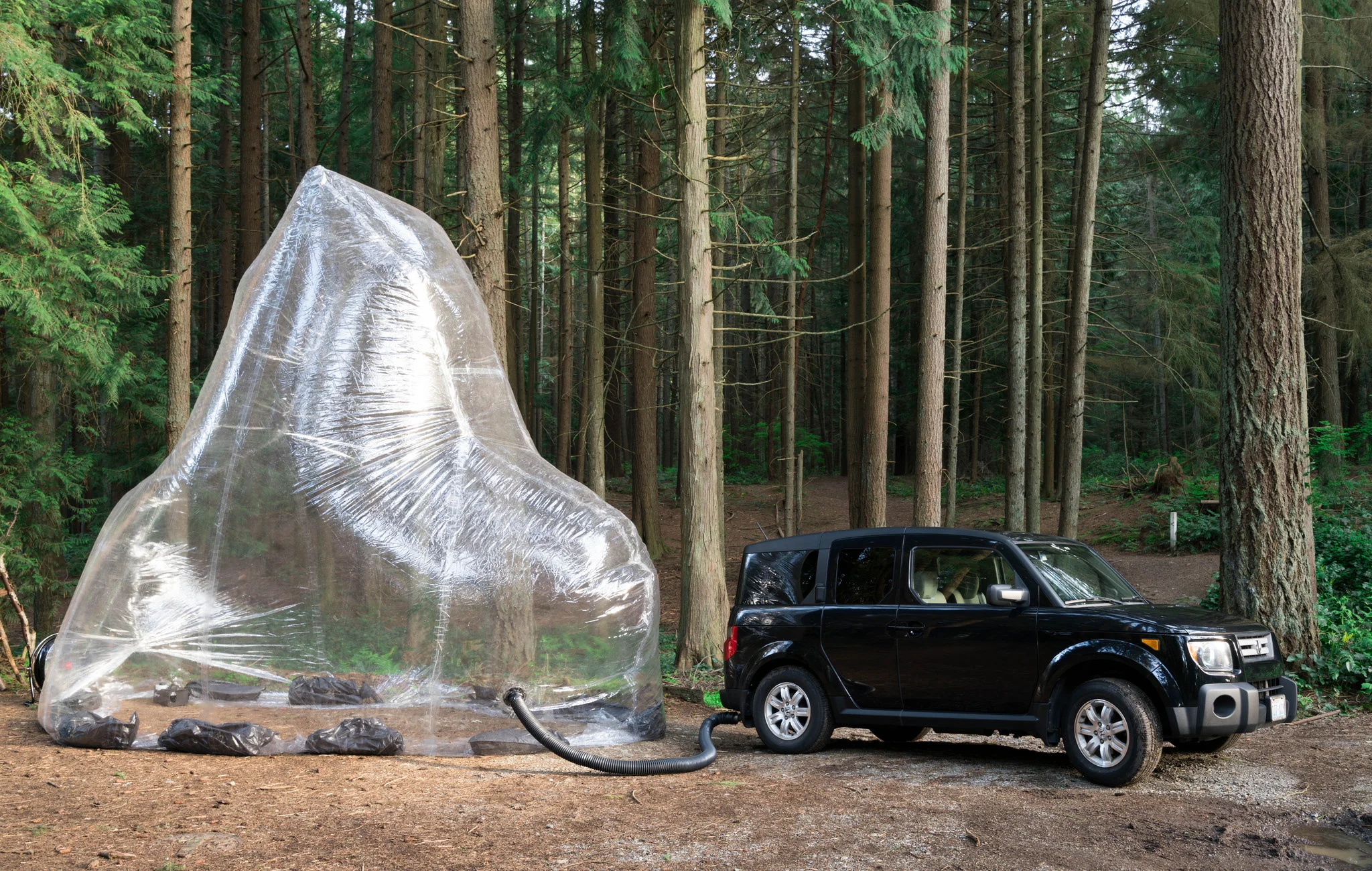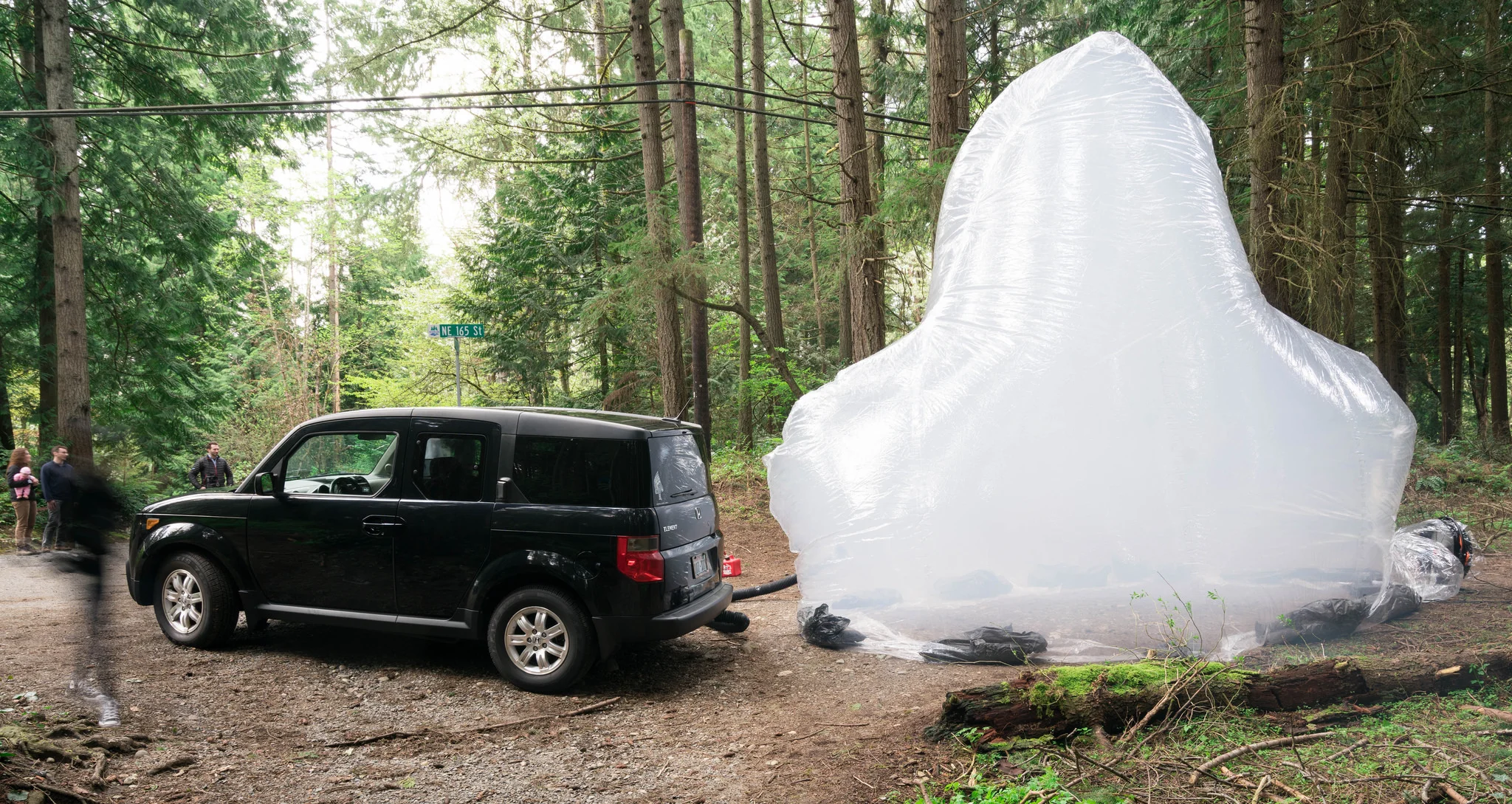 The extremely clear plastic was necessary in order for the piece to work as a stage which slowly and visibly fills with smoke over the course of a performance. While it appears that the cars is expelling exhaust into the inflatable we used a hidden smoke machine and a large fan to do the work (& keep the actors from dying). Because of its scale and necessary inclusion of an actual vehicle the first true test inflation of the piece didn't occur until an event earlier this spring at the Miller Community Center. That event was an opportunity to view the piece at scale, critique elements and chart a plan to make any tweaks.