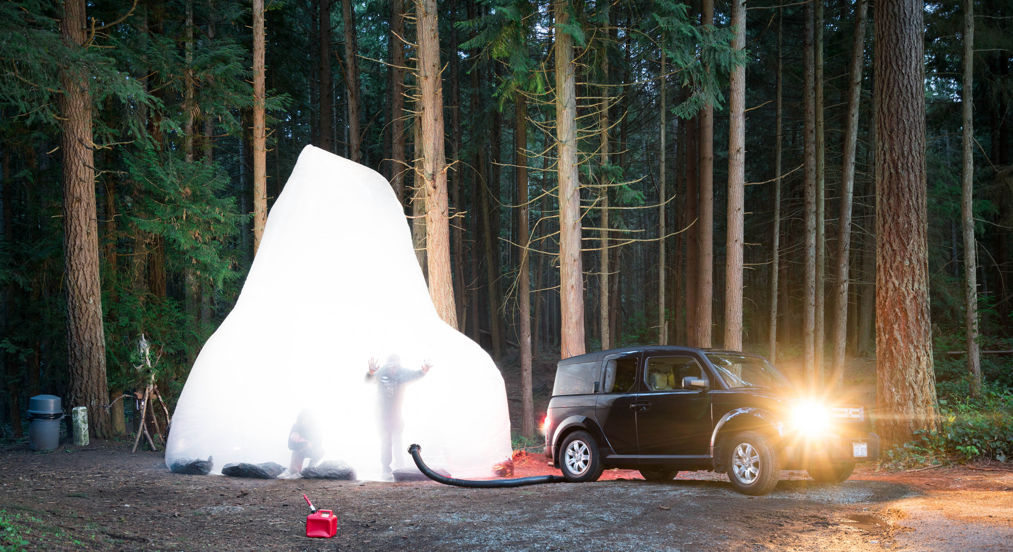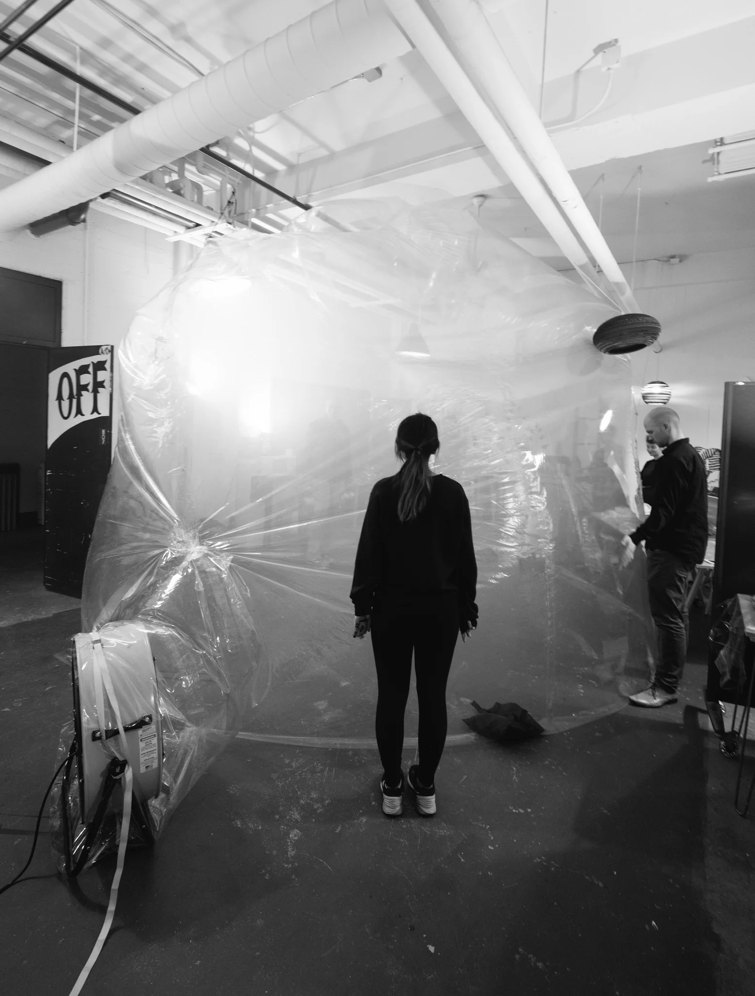 The inflatable, dubbed ABYX by Samaj, was a chance for us to explore some alternative means of construction and experiment with materials. We experimented with several construction processes like heat welding using irons, melting with heat guns, and even glue. Ultimately we discovered that our preferred material (an ultra clear protective window film) would grip itself quite well in the lateral direction and all we needed was to use our usual tape method to reinforce.