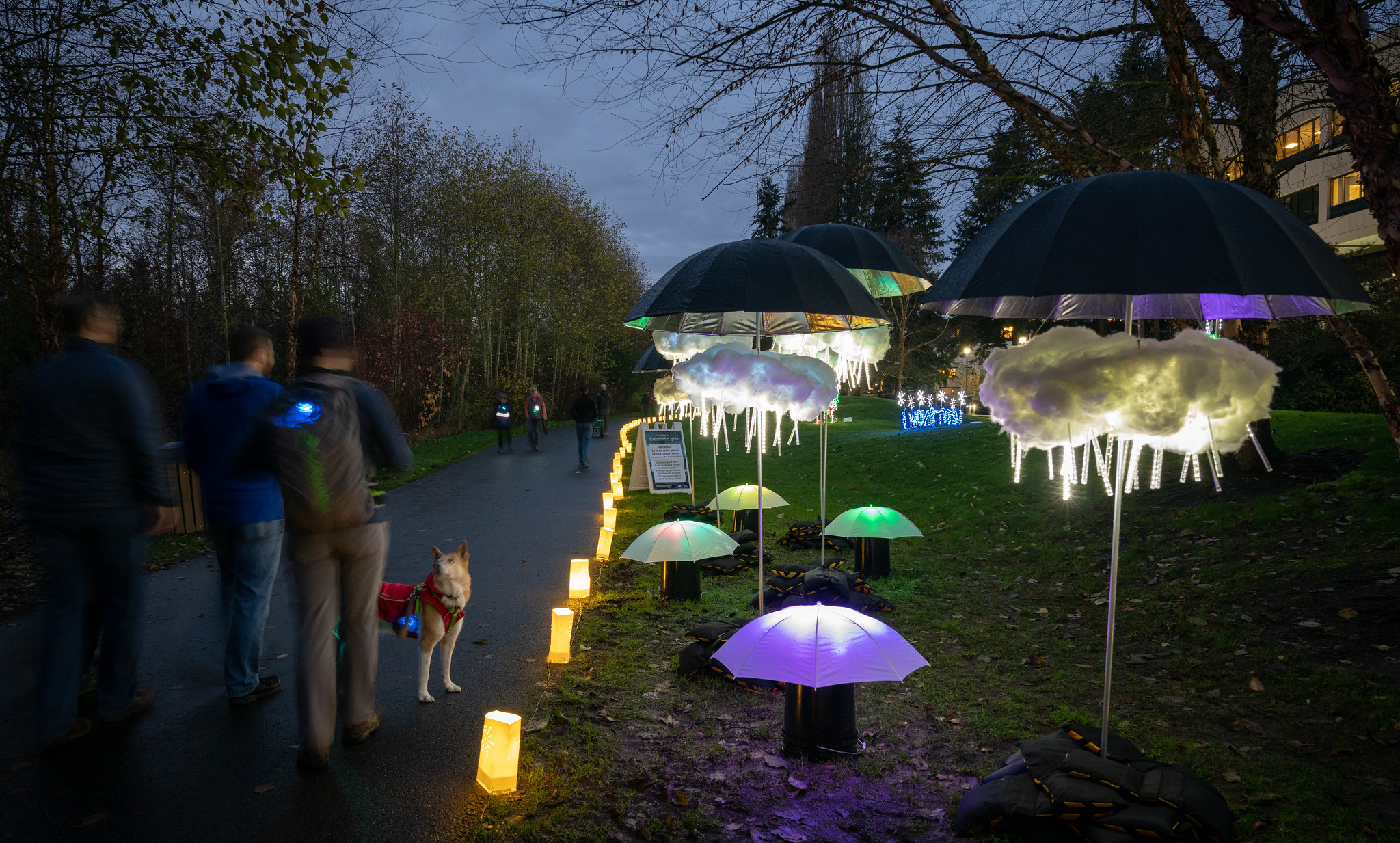 An illuminated art installation created for the 2018 Redmond Lights. Clouds made from recycled milk cartons and polyester furniture stuffing are internally lit with color changing LEDs and animated LED strips that give the appearance of lightning.