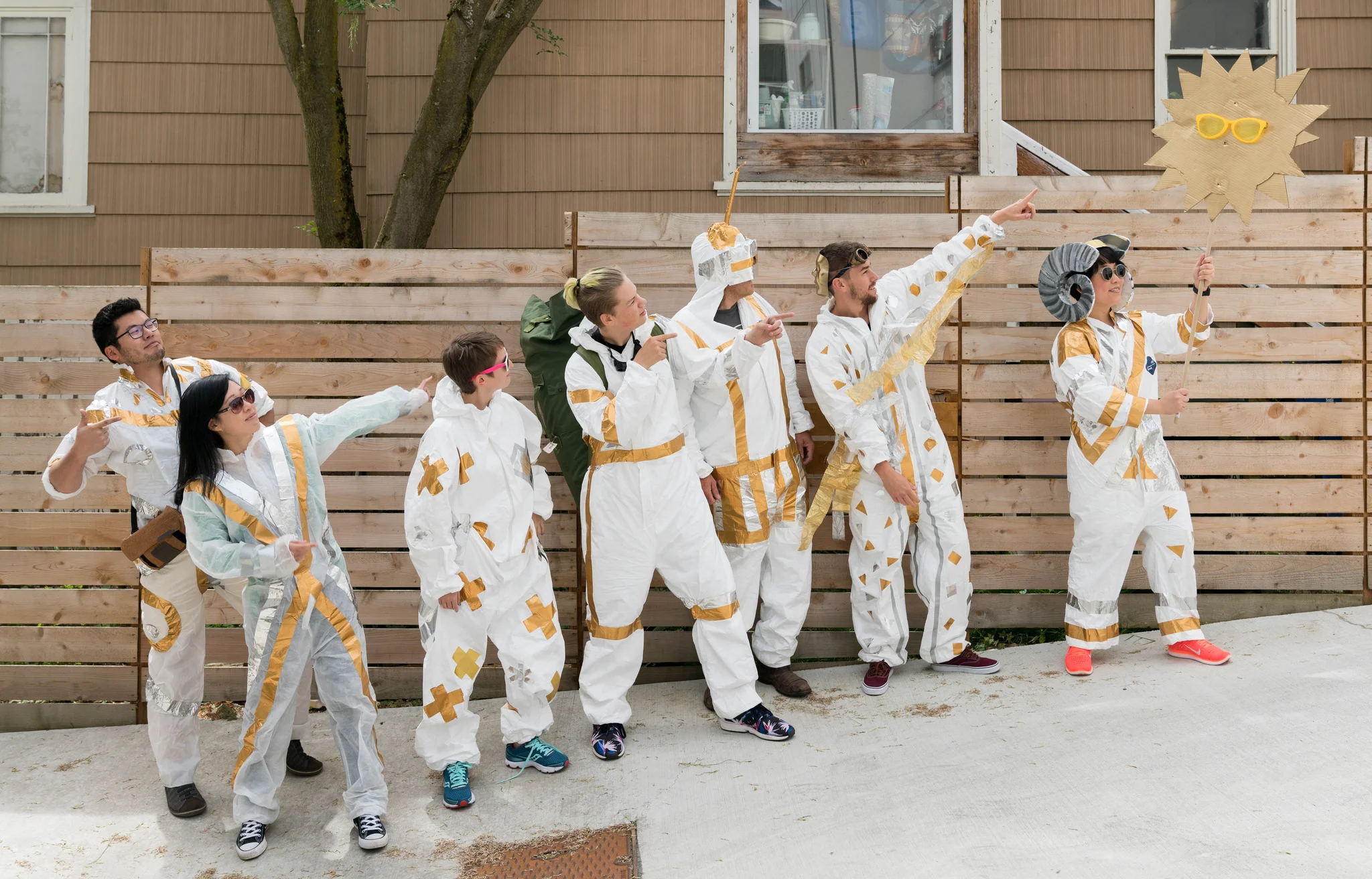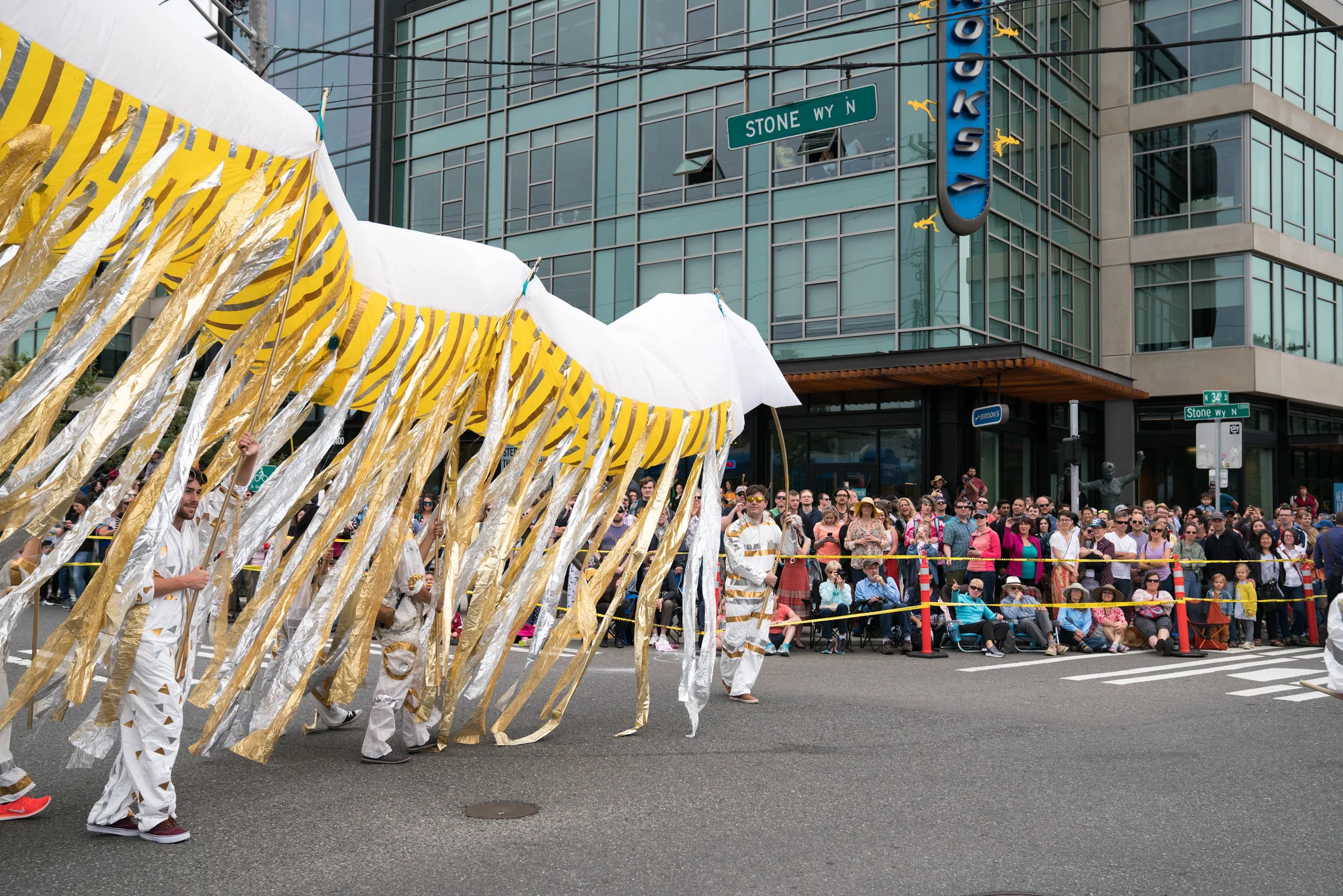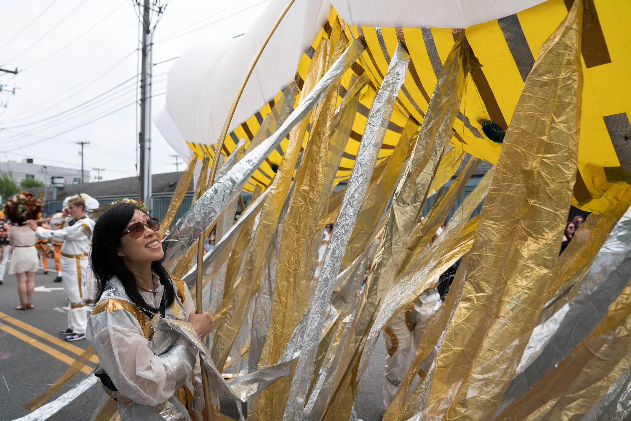 Created for the 2017 Fremont Solstice Parade, SunCloud takes Seattle's most infamous resident and swaps rain for rays of light. This inflatable cloud trails streamers of gold and silver as it jiggles and wiggles its way down the street. SunCloud was made by recycling our 2016 Solstice Parade float and powered by tiny mascot fans. The piece will be reused as a non-mobile art piece in 2017 and was awarded a 2017 McKay Parade Grant.