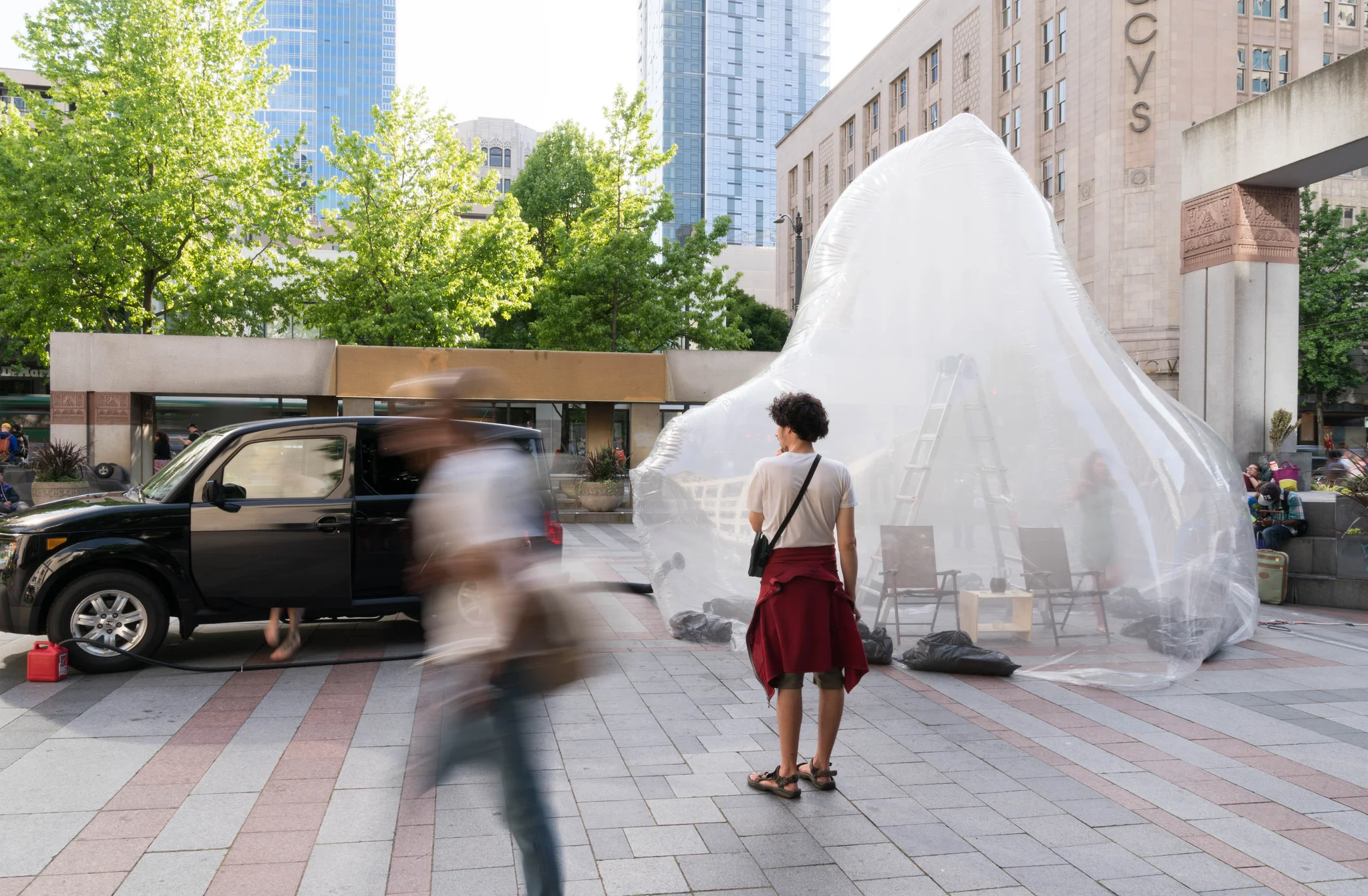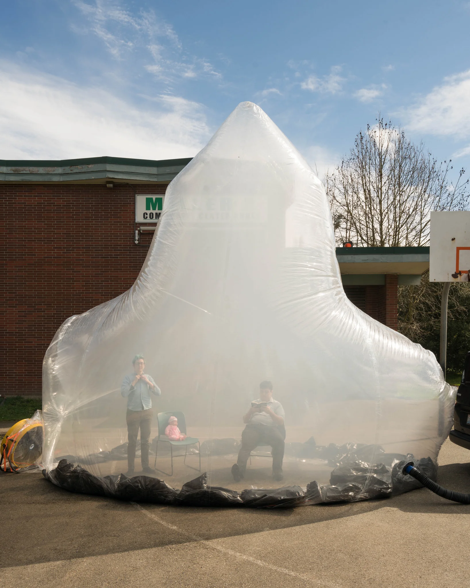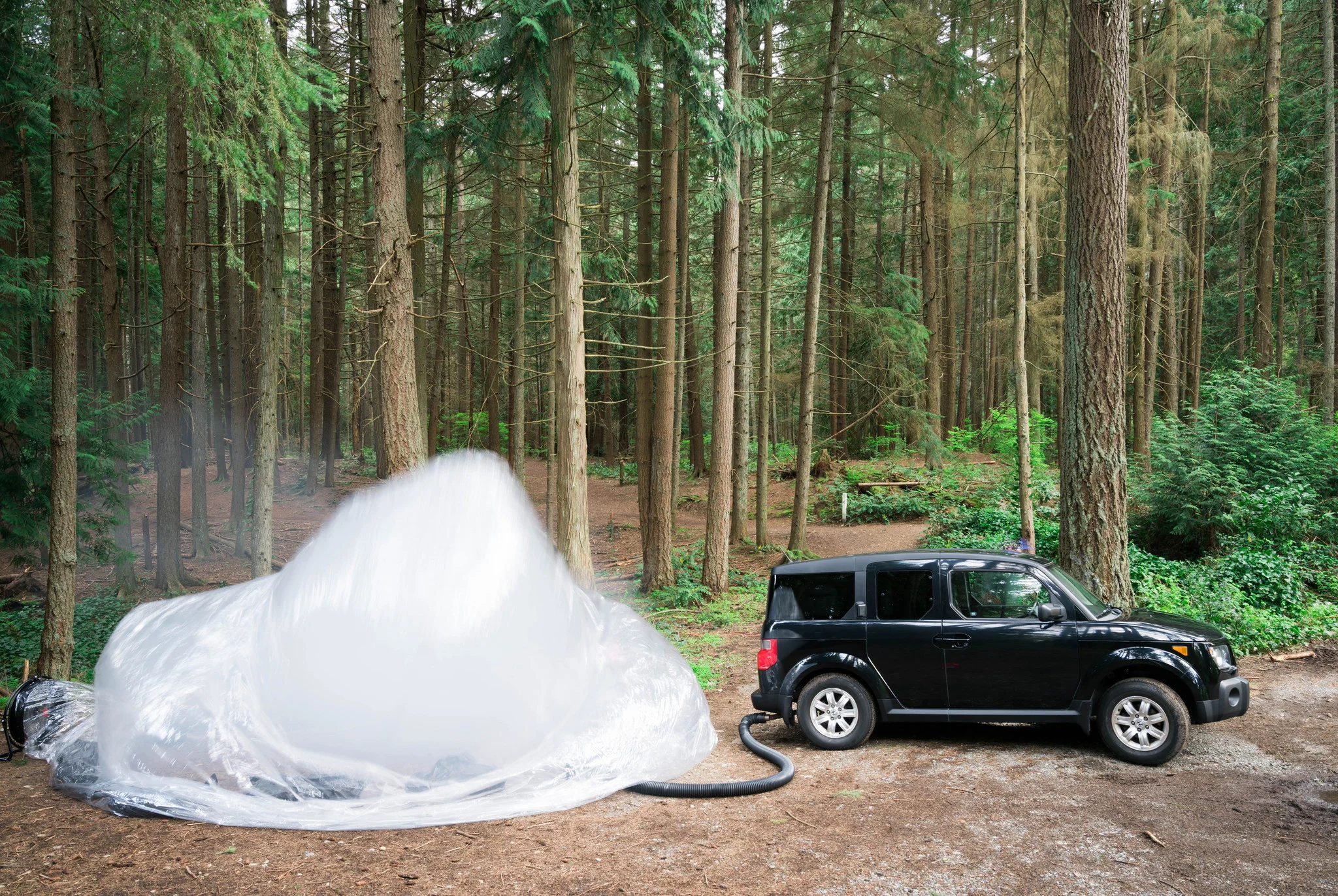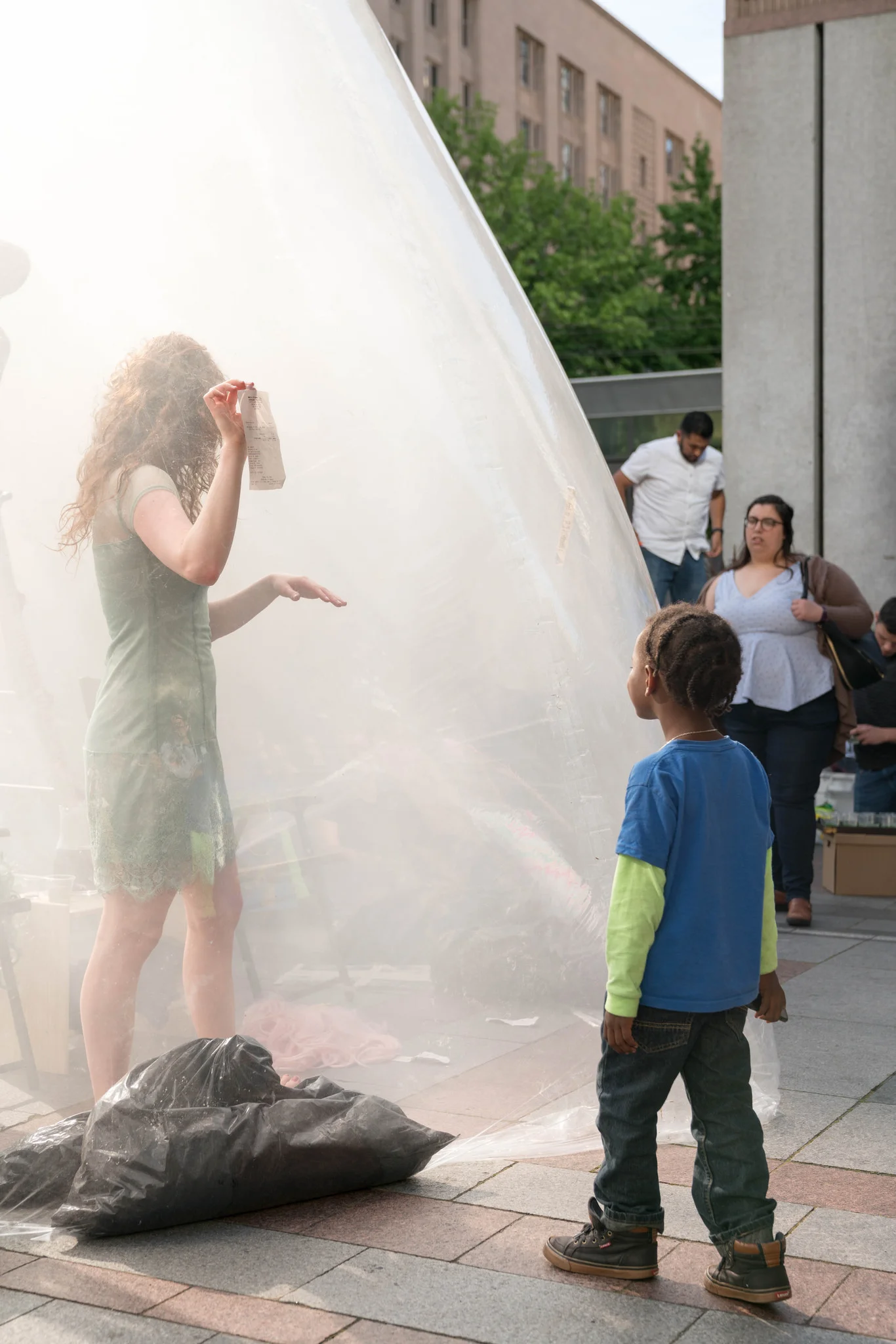 A collaboration with activist arts organization Coltura and artist Samaj, 'The Gas Trap' is meant to illustrate how an addiction to gasoline is slowly poisoning our habitat. The inflatable connects (visually) to a car using a large hose while the interior functions as a stage for an original performance piece by Alyssa Norling and Grace Orr.